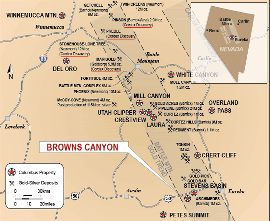 The Browns Canyon Project is located approximately 20 km (12 miles) west of Barrick Gold's Archimedes open pit gold mine, in the highly prospective Battle Mountain Gold Trend known to contain over 100 million ounces of Gold with some two dozen gold mines throughout the trend.
