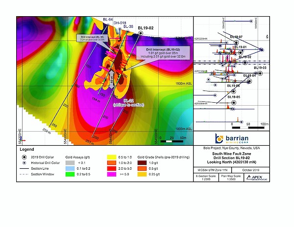 Hole BL19-02 (-65° dip / 270 azimuth) intersected 32.0 metres of 2.01 grams-per-tonne (g/t) gold starting at 67 metres down hole, within a broader zone of mineralization averaging 1.01 g/t gold over 85 metres starting at 49 metres down hole1. According to Barrian, these results extend the footprint of gold mineralization approximately 60 metres vertically below the previous drilling on section (Figure 1).