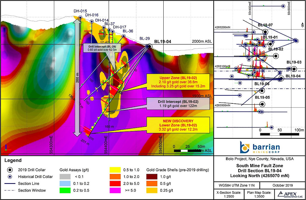 Hole BL19-04 (-55/270 azimuth) was drilled in the South Mine Fault Zone approximately 60 metres south of hole BL19-02 (see Barrian’s news release dated October 21, 2019) targeting the down-dip extension of previous intercepts drilled by Allegiant Gold (previously part of Columbus Gold) from hole BL-29, comprising 0.65 g/t Au over 62.5 m, including 1.55 g/t Au over 6.1 m and 1.80 g/t Au over 7.6 m. BL19-04 intersected Carlin-style oxide gold mineralization in an upper mineralized zone between 25 and 40 metres vertically below BL-29, in visibly altered (silicified and oxidized) siltstones and cherty limestones within hanging wall Cambrian Windfall Formation and footwall Silurian Roberts Mountain Formation dolomite. The zone is associated with highly anomalous pathfinder element (arsenic and antimony) concentrations from the on-site x-ray fluorescence (XRF) analysis and laboratory multi-element analysis. The upper zone corresponds with the down-dip projection of the BL-29 intercept, with a significant improvement in gold grade and continuity.