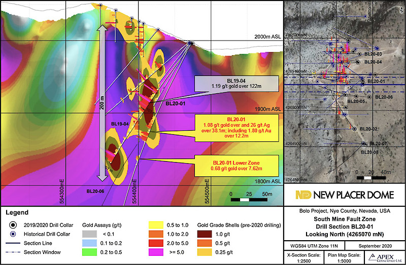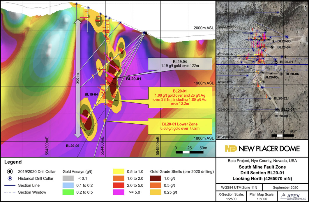 As reported by New Placer, drill-hole BL20-01, located in the South Mine Fault Zone, intersected 1.08 g/t gold and 26 g/t silver over 38.1 metres; including 1.80 g/t gold over 12.2 metres (Table 1). The BL20-01 intercept expands gold mineralization approximately 40 metres vertically below 2019 drill-hole BL19-04 that intersected 122 metres of 1.2 g/t gold in hole BL19-0411,2 and delivers on one of the key goals of the 2020 Bolo Project drill campaign, which is set to test Carlin-style gold mineralization at depth in the South Mine Fault Zone where it remains open and untested (Figure 1 below).