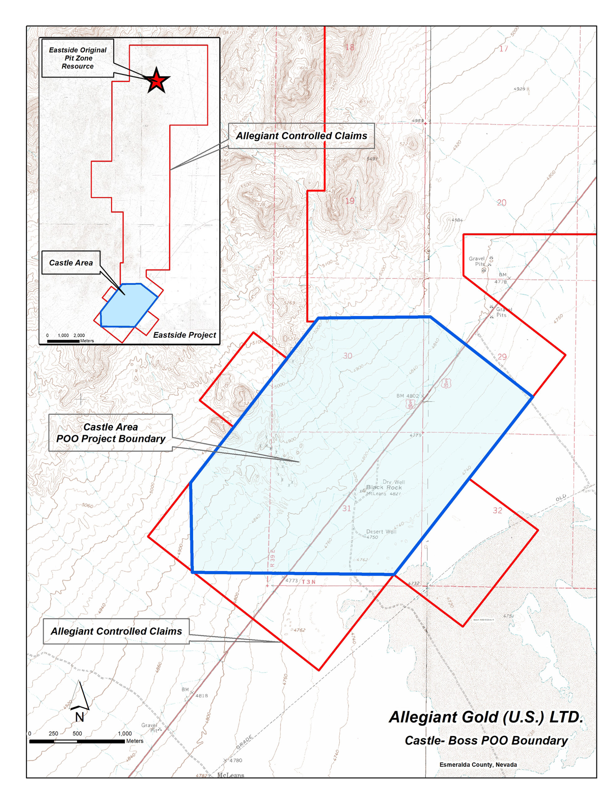 The updated resource estimate (“Updated Resource Estimate and NI 43-101 Technical Report, Eastside and Castle Gold-Silver Project Technical Report, Esmeralda County, Nevada”) was conducted by Mine Development Associates (“MDA”) of Reno, Nevada with an effective date of July 30, 2021. Contained pit-constrained Inferred Resources (cut-off grade of 0.15 g/t) of 1,090,00 Au ounces at 61,730,000 tonnes at 0.55 g/t Au and 8,700,000 Ag ounces at 4.4 g/t Ag at the Original Pit Zone and 314,000 Au ounces at 19,986,000 tonnes at 0.49 g/t Au at the Castle Area. In accordance with NI 43-101 the MDA Technical Report dated July 30, 2021 is filed on SEDAR. This report builds on and supersedes the NI 43-101 reports of Ristorcelli (December 2016), Ristorcelli (July 2017) and Ristorcelli (January 2020) titled “Resource Estimate and Technical Report, Eastside Gold-Silver Project, Esmeralda County, Nevada” prepared for Allegiant with an Effective Date of July 25, 2017.